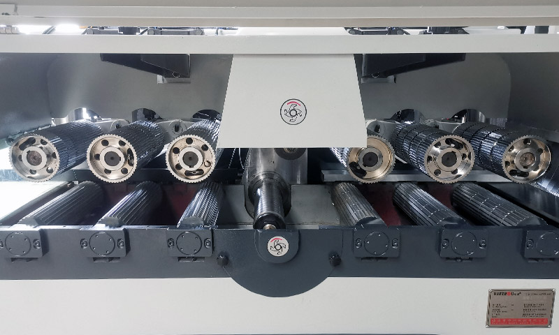 2.上送料動(dòng)力輪6組,下送料輪6組,送料強(qiáng)勁有力,壓緊木料之壓力由壓料氣缸控制,可視木料硬度情形,自由調(diào)整。